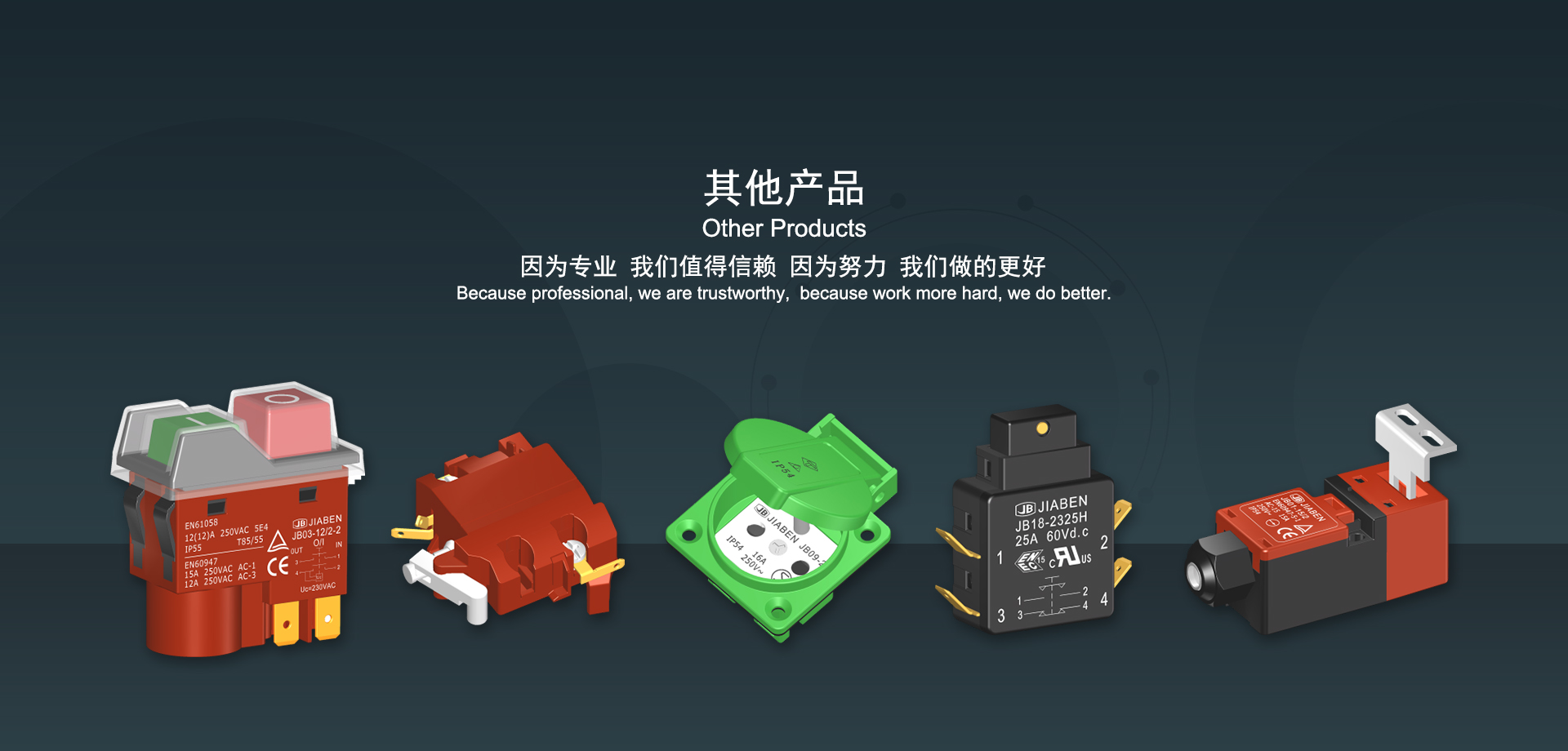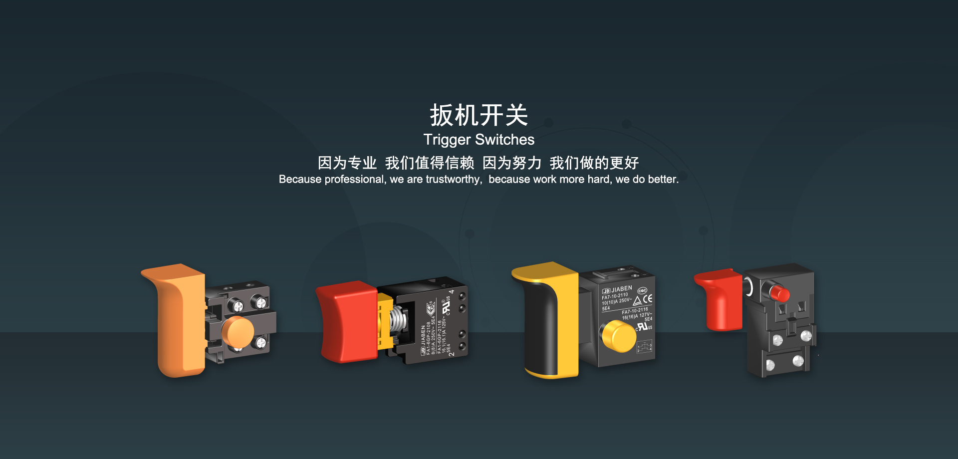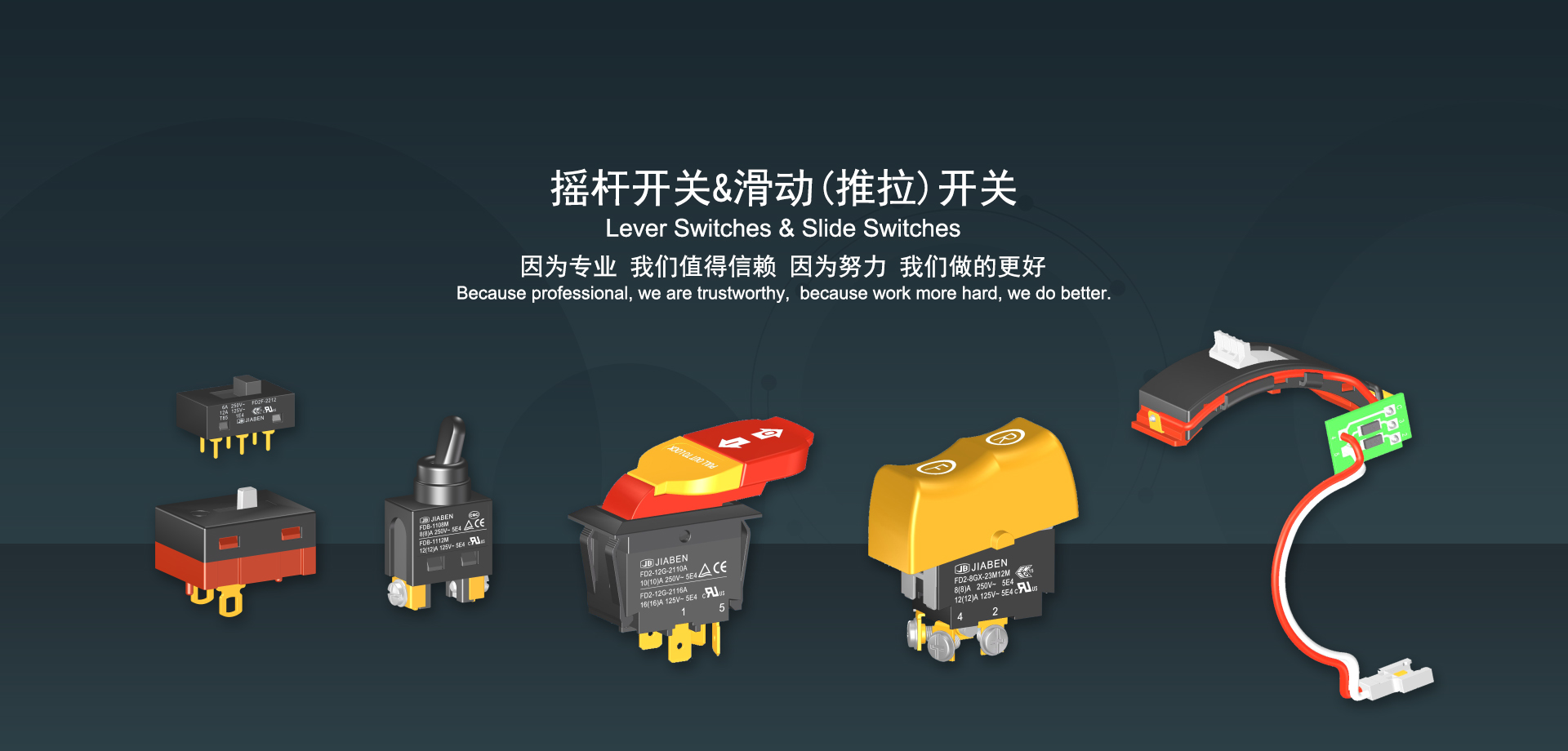 浙江佳奔電子有限公司始建于1986年,坐落于浙江省樂清市虹橋鎮(zhèn)東電子信息產(chǎn)業(yè)園內(nèi),現(xiàn)有職工700多人,資產(chǎn)總額超3億元。公司主要經(jīng)營“JIABEN”牌微動開關、蹺板開關、按鈕開關、扳機開關、調(diào)速開關和電位器開關等各類交、直流器具開關和各類交、直流線路板模塊等產(chǎn)品,主要應用于交、直流電動工具、電動園林工具、清潔器具、家用電器和小型機床等行業(yè),是集產(chǎn)品設計、研發(fā)、制造、銷售和服務于一體的國家高新技術企業(yè)。JIABEN was founded in 1986, located in East Electronic Information Industry Park, Hongqiao Town, Yueqing City, Zhejiang Proviance, existing staff more than 700 peoples, more than 300 million RMB worth of assets. Company is mainly engaged in "JIABEN" brand Micro Switch, Rocker Switch, Push-button Switch, Trigger Switch, Speed Regulating Switch, Potentiometer Switch and other kinds of appliance switch and all kinds of AC or DC circuit board module, such as more than 100 series, 8000 kinds of models of products, mainly used in AC or DC Power-tools, Power Gardening Tools, Cleaning Appliances, Household Appliances and Small Machine Tool and other industries, is the collection product design, research and development, manufacturing, sales and service in one of the national high and new technology enterprise.